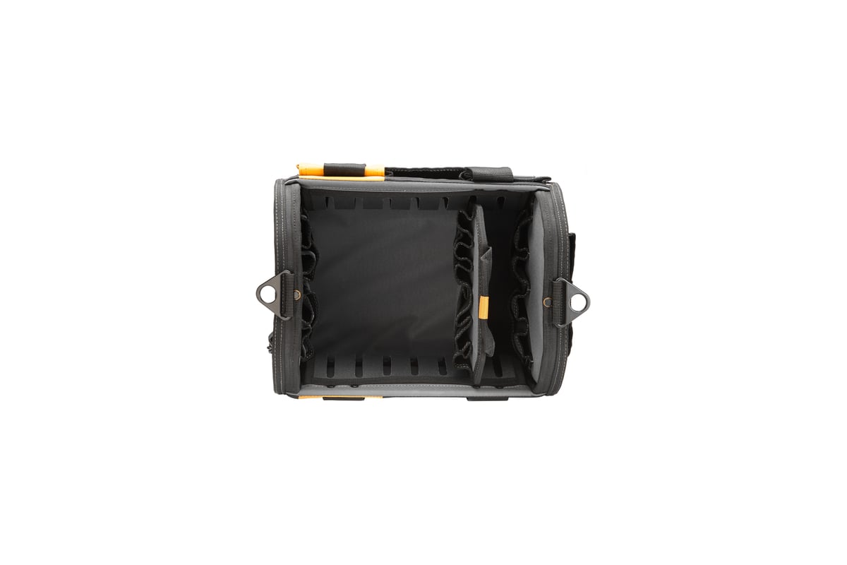 Имеет 3 съемных разделителя для инструментов с карманами, которые позволяют оптимально организовать пространство внутри сумки исходя из собственных потребностей и условий выполняемой работы. К одному разделителю прилагается подставка для удобного размещения вне сумки. Также в модели предусмотрены крытый карман для ноутбука, зажим для рулетки, ремешок со стальным крючком, мягкая ручка, 61 карман и петли.